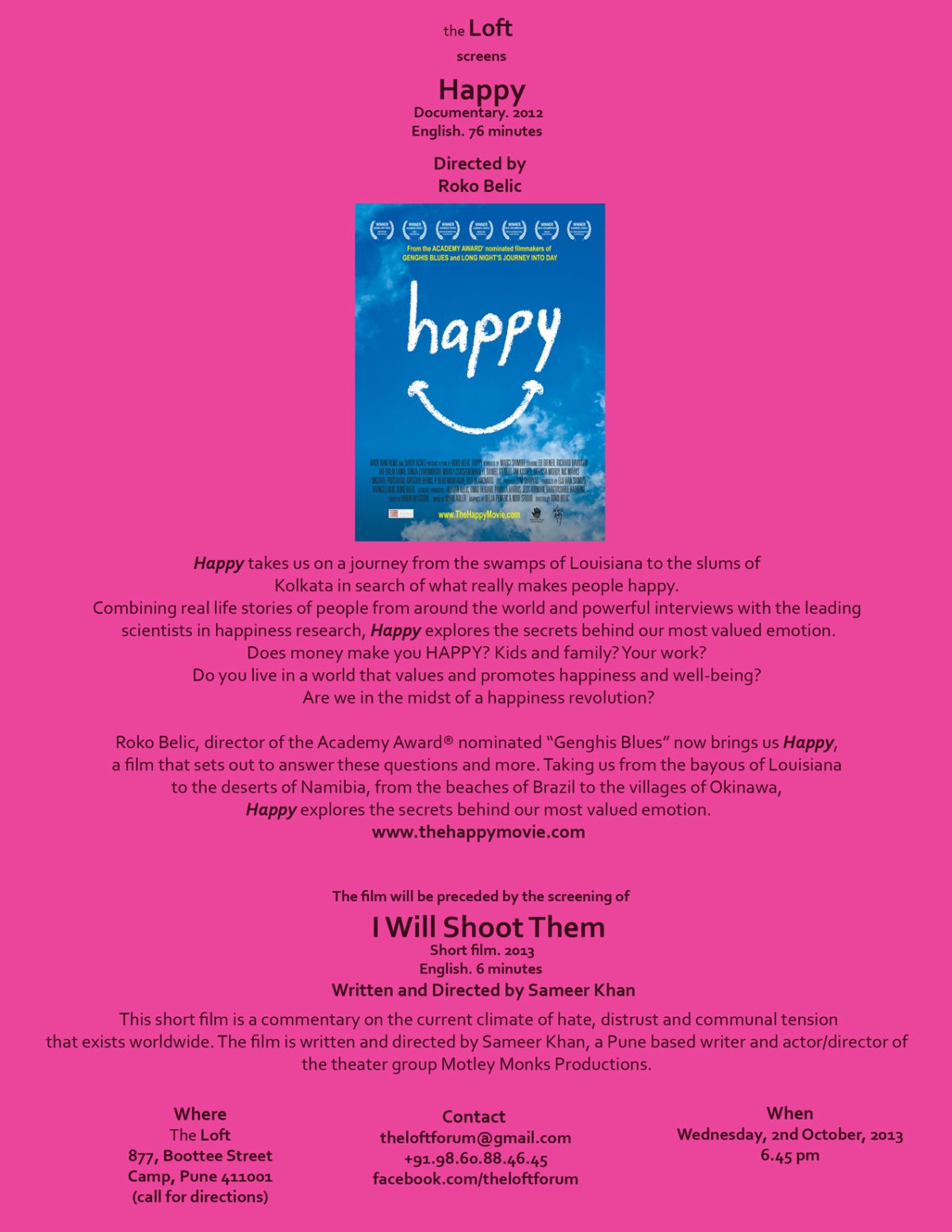 Combining real life stories of people from around the world and powerful interviews with the leading scientists in happiness research, Happy explores the secrets behind our most valued emotion. Does money make you HAPPY? Kids and family? Your work? Do you live in a world that values and promotes happiness and well-being? Are we in the midst of a happiness revolution?
