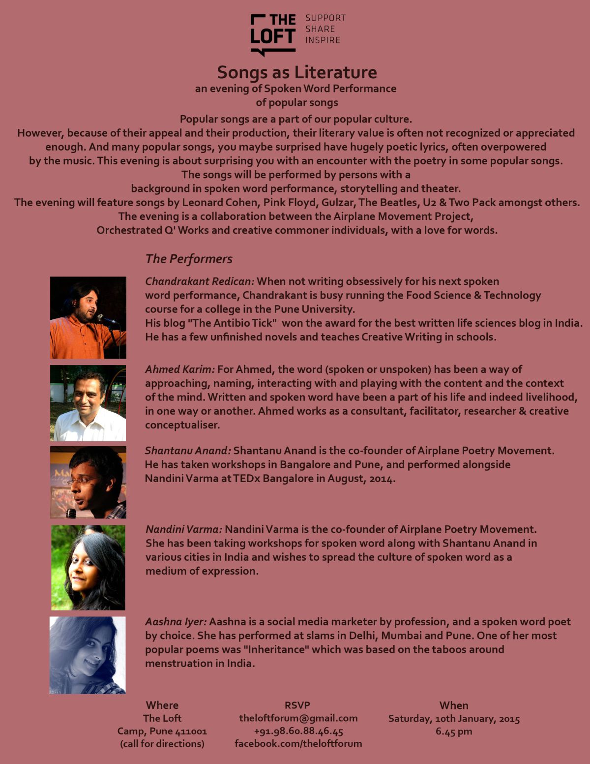 The evening will feature songs by Leonard Cohen, Pink Floyd, Gulzar, The Beatles, U2 & Two Pack amongst others.