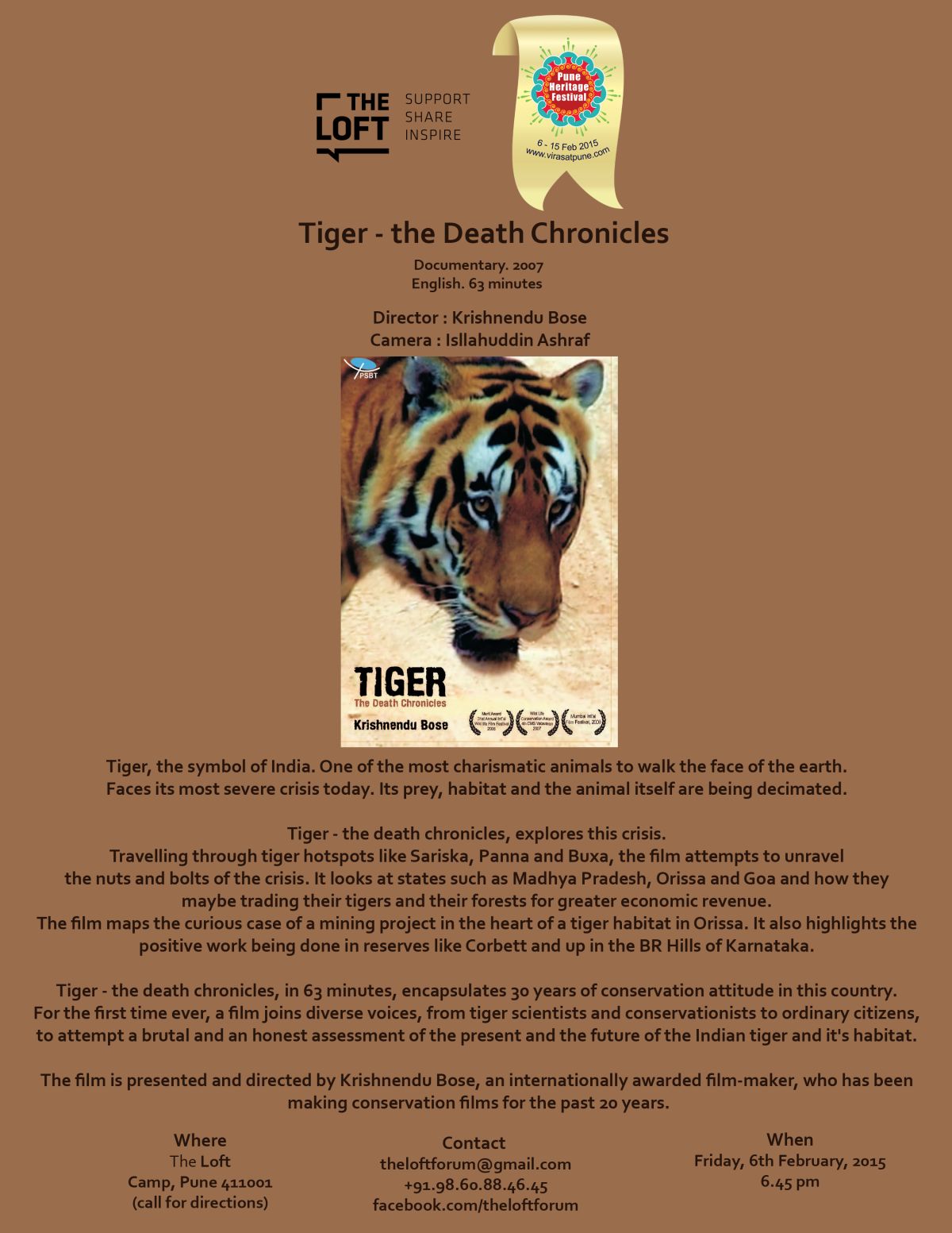 Tiger - the death chronicles, in 63 minutes, encapsulates 30 years of conservation attitude in this country. For the first time ever, a film joins diverse voices, from tiger scientists and conservationists to ordinary citizens, to attempt a brutal and an honest assessment of the present and the future of the Indian tiger and it’s habitat.